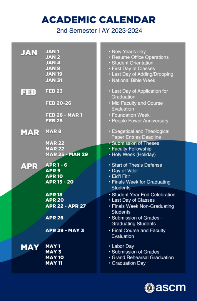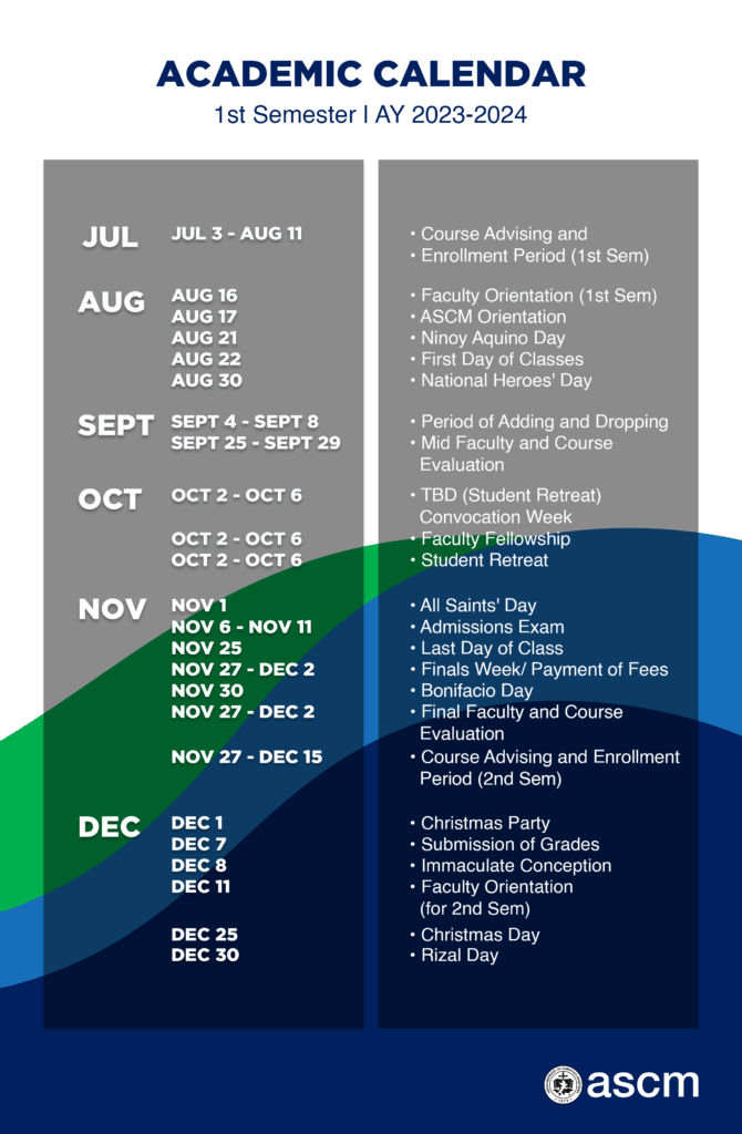 To give you an overview of the events this Academic Year 2023-2024 at ASCM, we provide you this. For more information you may contact us in our email: info@ascm.edu.ph or via this link http://ascm.edu.ph/contact/